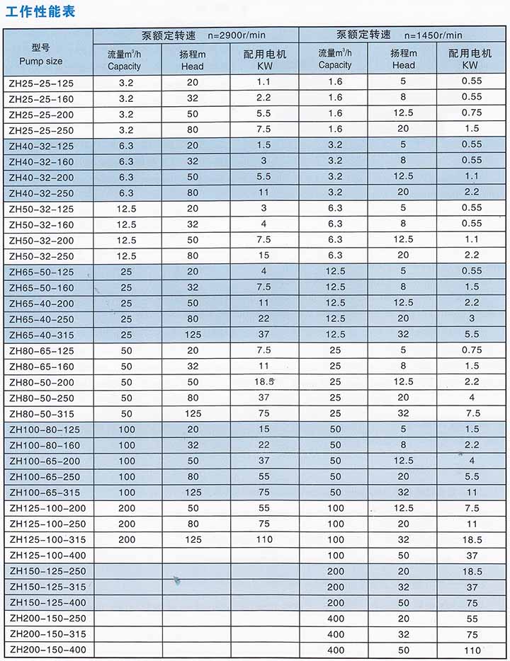 概述: ZH型耐溫耐腐自吸式化工離心泵是我公司結(jié)合國內(nèi)外同類產(chǎn)品研制生產(chǎn)的-種單級單吸自吸式化工離心泵,該泵適用于輸送溫度0℃~150℃,含固體顆粒小于3毫米腐蝕性介質(zhì)。 如輸送介質(zhì)含有3毫米以上顆?;蚶w維,可選用我公司生產(chǎn)的ZW系列無堵塞自吸泵。 泵的性能范圍:流量為1.6~400m3/h、揚程為5~125m。上吸高度為5米以內(nèi)。 根據(jù)所輸送介質(zhì)的不同,ZH型自吸式化工離心泵接觸液體部分的材料可選用鑄鐵、鑄鋼、1Cr18Ni9Ti、1Cr18Ni12M02Ti、316、316L等材料制造。 泵型號意義說明 Z——自吸式泵代號the item of spontaneous imbibition pump H——化工離心泵代號the item of chemical industrycentrifugal pump 50--泵吸入口直徑(mm)the sunction inlet diameter 32--泵出液口直徑(mm)the sunction outlet diameter 160--泵葉輪名義直徑(mm)the nominal impeller diameter A--切割葉輪直徑順序,以A、B、C表示The diameter order of incising impeller,show as A,B,C