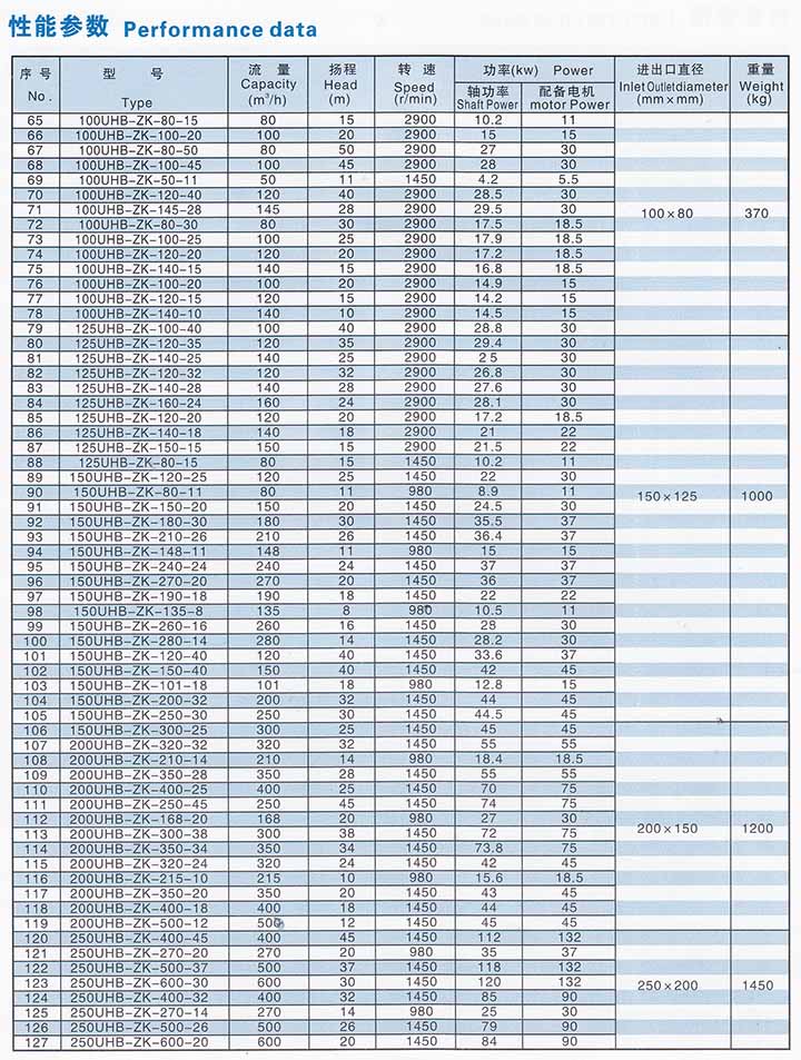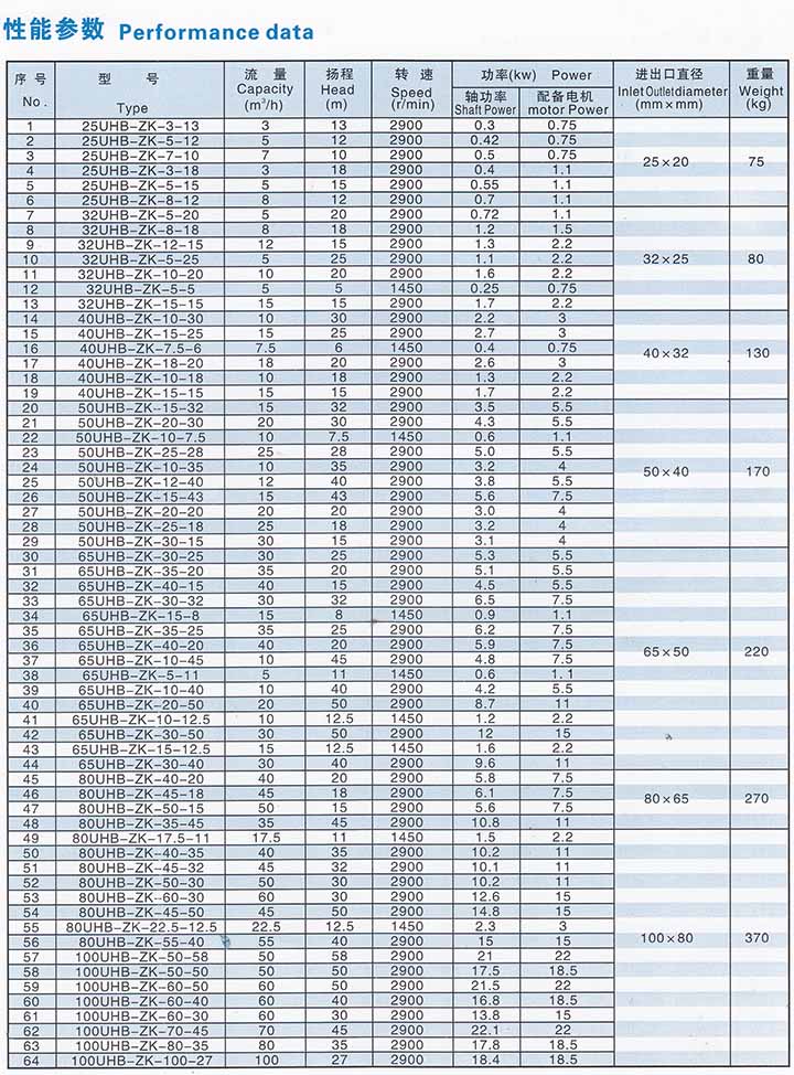 概述: 本系列泵屬單級(jí)單吸懸臂式離心泵,過流部件采用鋼襯超高分子量聚乙烯(UHMWPE)。該材質(zhì)是目前國際上新代的泵用耐腐耐磨工程塑料。其最突出的優(yōu)點(diǎn)是在所有的塑料中它具有優(yōu)異的耐磨性、耐沖擊性(尤其是耐低溫沖擊)抗蠕變性(耐環(huán)境應(yīng)力開裂)和極好的耐腐蝕性。 該泵顯著特點(diǎn)是:多功能,即-種泵能適應(yīng)各種不同的工況,如輸送酸、堿性清液或料漿;冶煉行業(yè)各種腐蝕性礦漿;硫酸行業(yè)各類稀酸;環(huán)保行業(yè)各類污水等。該泵既耐腐蝕又耐磨損,使用范圍十分廣泛。 (-)主要技術(shù)性簡(jiǎn)述 1.型號(hào):UHB-ZK系列 2.特點(diǎn):耐腐耐磨,-泵多用,酸堿類清液料漿均適用。 3。結(jié)構(gòu):(1)泵體為超高分子量聚乙烯模壓成型,使用壽命是普通襯套泵的5-6倍。襯層厚8~20mm。 (2)葉輪分開式,閉式二種,可根據(jù)介質(zhì)狀況任選。 (3)密封:K型動(dòng)力密封。 4.適用介質(zhì):濃度80%以下硫酸,50%以下硝酸,各種濃度的鹽酸,液堿,既適用清液也適用料漿。 5.主要技術(shù)參數(shù):使用溫度-20℃~80℃(對(duì)特殊要求、使用改性材質(zhì),可提高到105℃),進(jìn)口φ32mm~φ250mm。流量5~600m3/h,揚(yáng)程50m以內(nèi)。