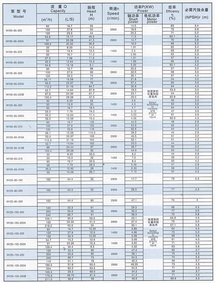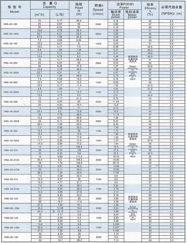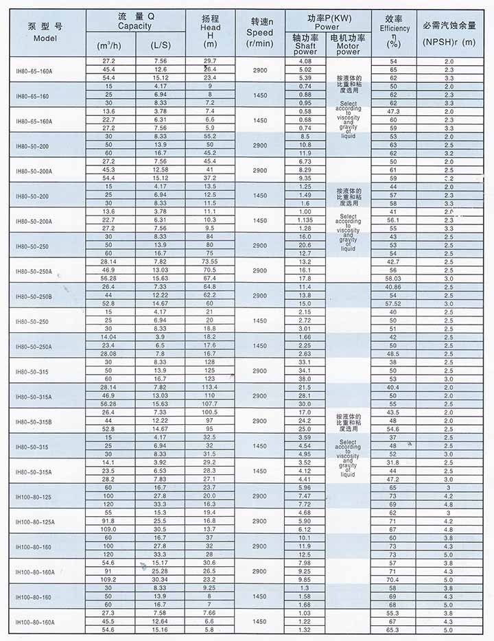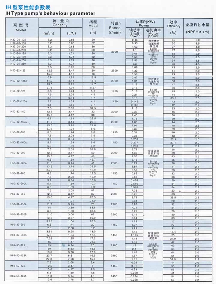 IH型系列泵有40個(gè)基本型,其中33個(gè)雙速(2900、1450r/min)經(jīng)過(guò)A、B兩種型式的葉輪直徑切割變型后,達(dá)112個(gè)規(guī)格。